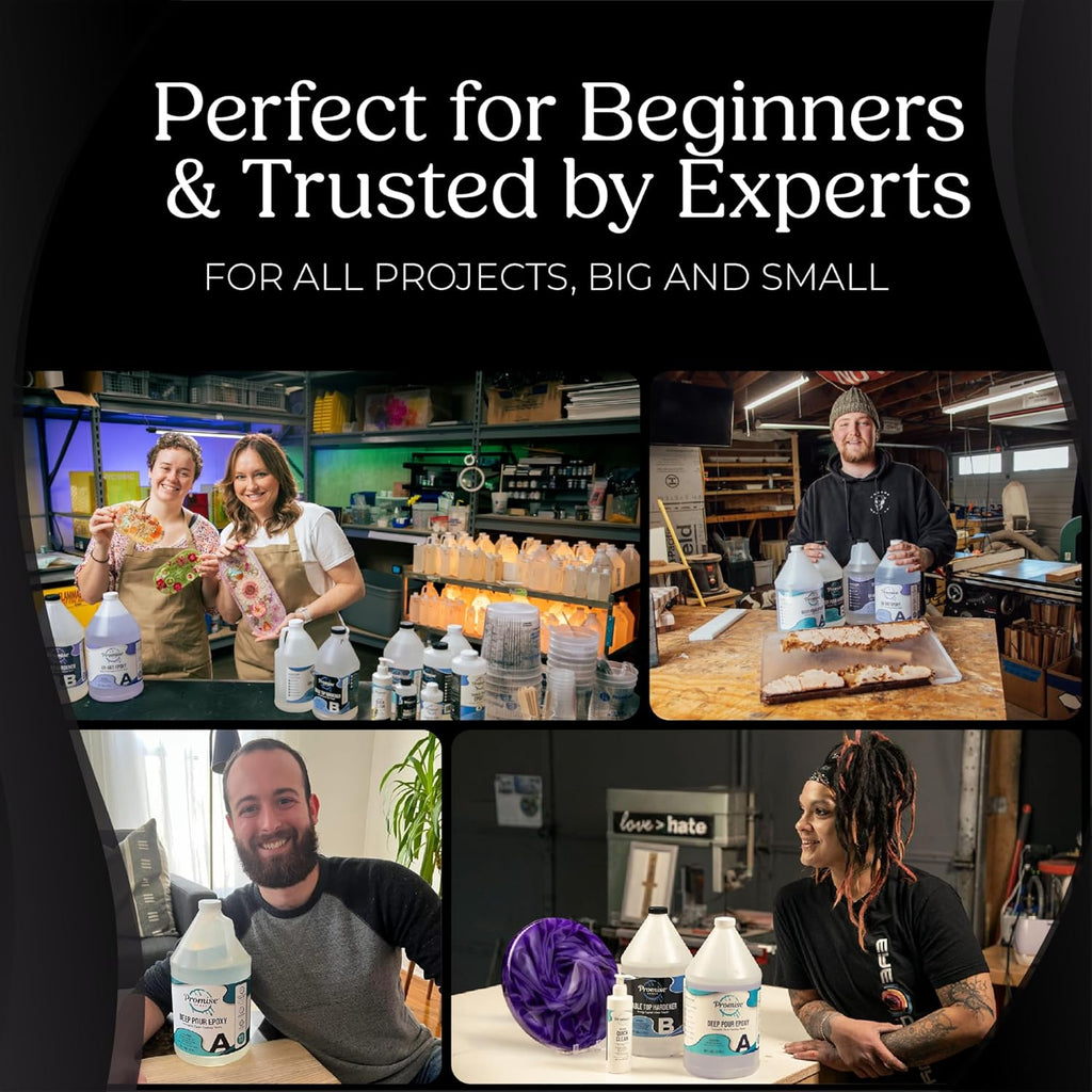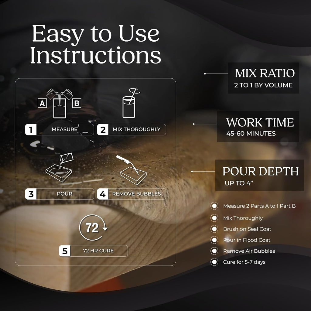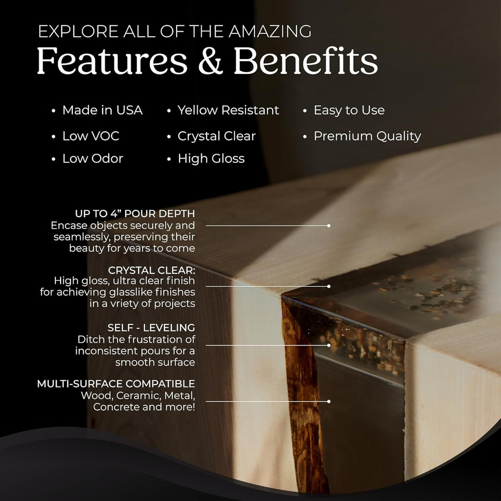 - Deep Pour Capability - Our epoxy resin kit offers a deep pour of up to 4", perfect for casting and encapsulating objects in crystal clear resin. Ideal for creating river tables, live edges, arts and craft tables, and artistic embedments.