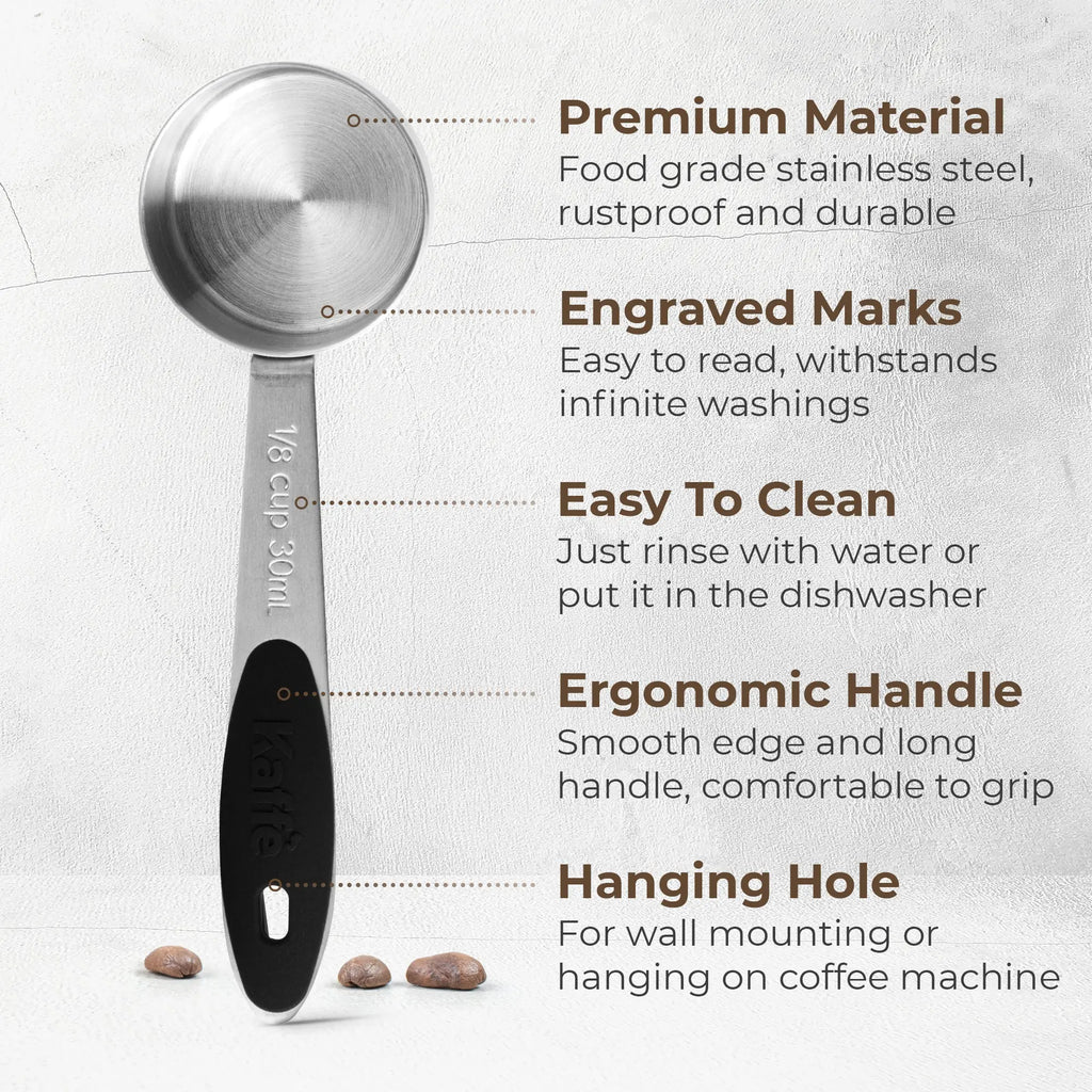 - ☕ PERMANENT ENGRAVED MEASURING MARKS - Experience lasting precision with our coffee measuring spoon, featuring 3D engraved measurements directly on the handle. Showcasing dual measurements of 1/8 cups and 30ml, these permanent marks ensure accuracy in your coffee preparation, forever eliminating the concern of fading or wearing away.