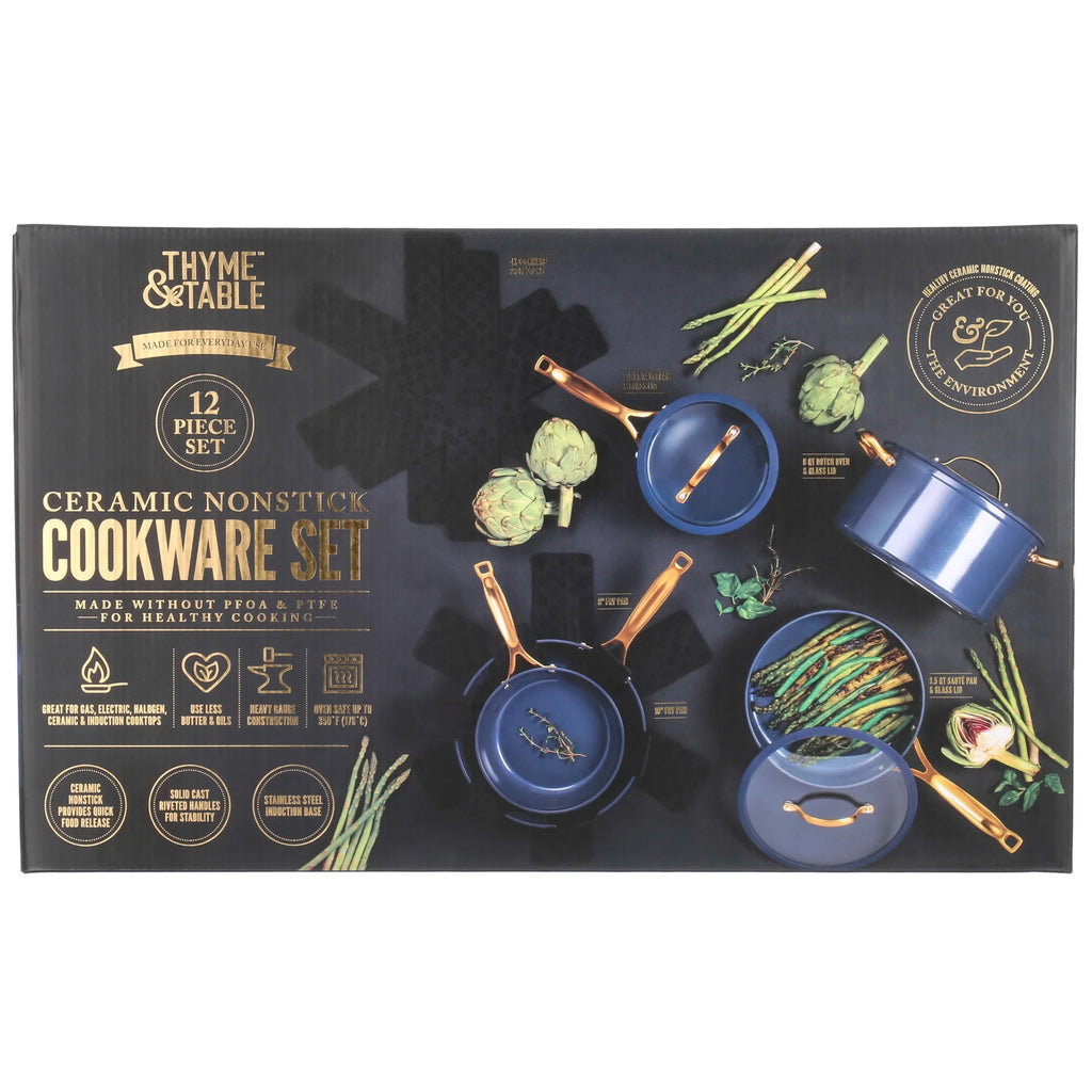 Introducing the Thyme & Table 12-Piece Ceramic Non-Stick Signature Cookware Set in an elegant blue hue with luxurious gold handles. This cookware set is a perfect combination of style and practicality, designed to enhance your culinary experience. With a comprehensive selection of pots and pans, this set is ideal for both novice cooks and seasoned chefs, providing everything you need to tackle a wide range of cooking tasks, from frying and searing to simmering and boiling.