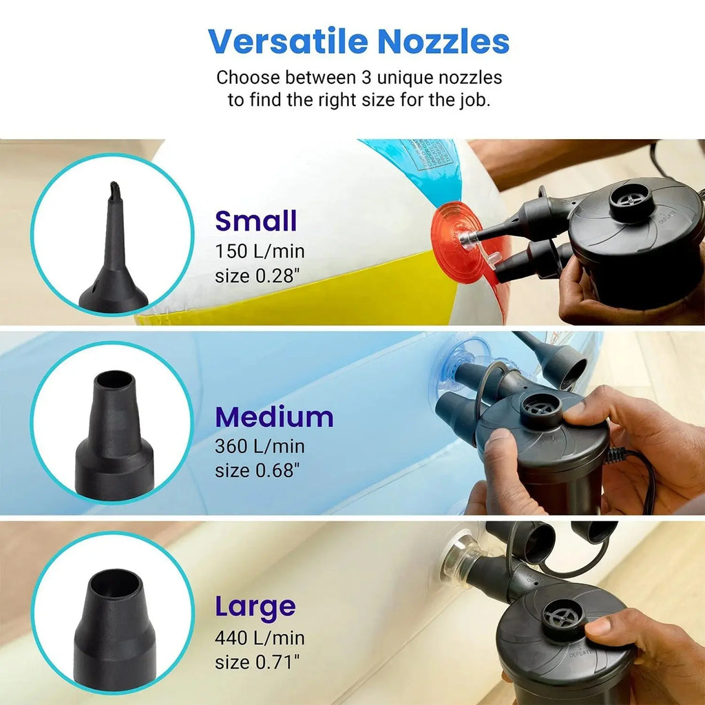 This air pump is a high-flow low-pressure pump, suitable for inflatable beds, car inflatable cushions, inflatable sofas, inflatable toys, tumblers, unicorns, yoga balls, kayaks, inflatable boats, swimming pools, swimming laps, vacuum storage bags, etc. It cannot be used to inflate tires, football basketballs, balloons, and air column bags. Fast pumping speed, time-saving. Compact, lightweight, and easy to use, provide convenience. The three different sizes of nozzles allow you to inflate/deflate most inflatable items. The low-noise design can best serve your needs when it requires fast and quiet inflating/deflating. Pick up the right nozzle and plug it into the power