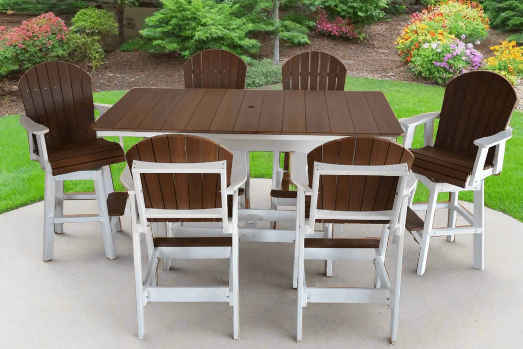 Our Poly 6′ Rectangle Table Set with two swivel Adirondack chairs and four standard Adirondack chairs is perfect for any patio or outdoor living space. This table is crafted with eco-friendly poly material and will last for generations to come. All tables and chairs are Amish made with Amish quality craftsmanship and will never crack, splinter, fade or rust! All poly tables and chairs are available in many color options. Perfect for any patio, porch or outdoor living space. All pieces come with a money back guarantee.