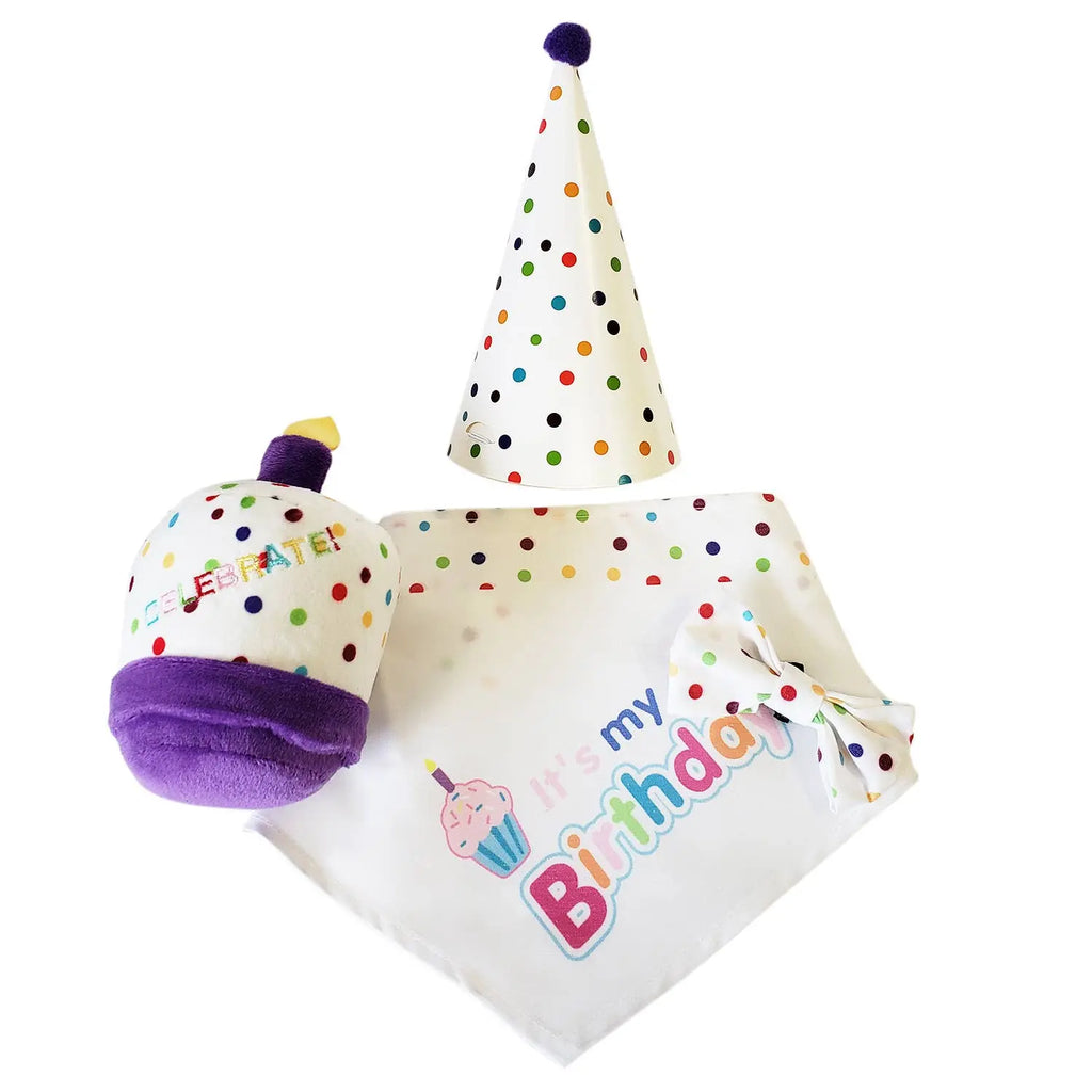 - Complete Celebration Kit – A thoughtfully curated 4-piece set featuring a bandana, hat, bow tie, and a fun squeaky plush toy to create a fun-filled birthday experience.