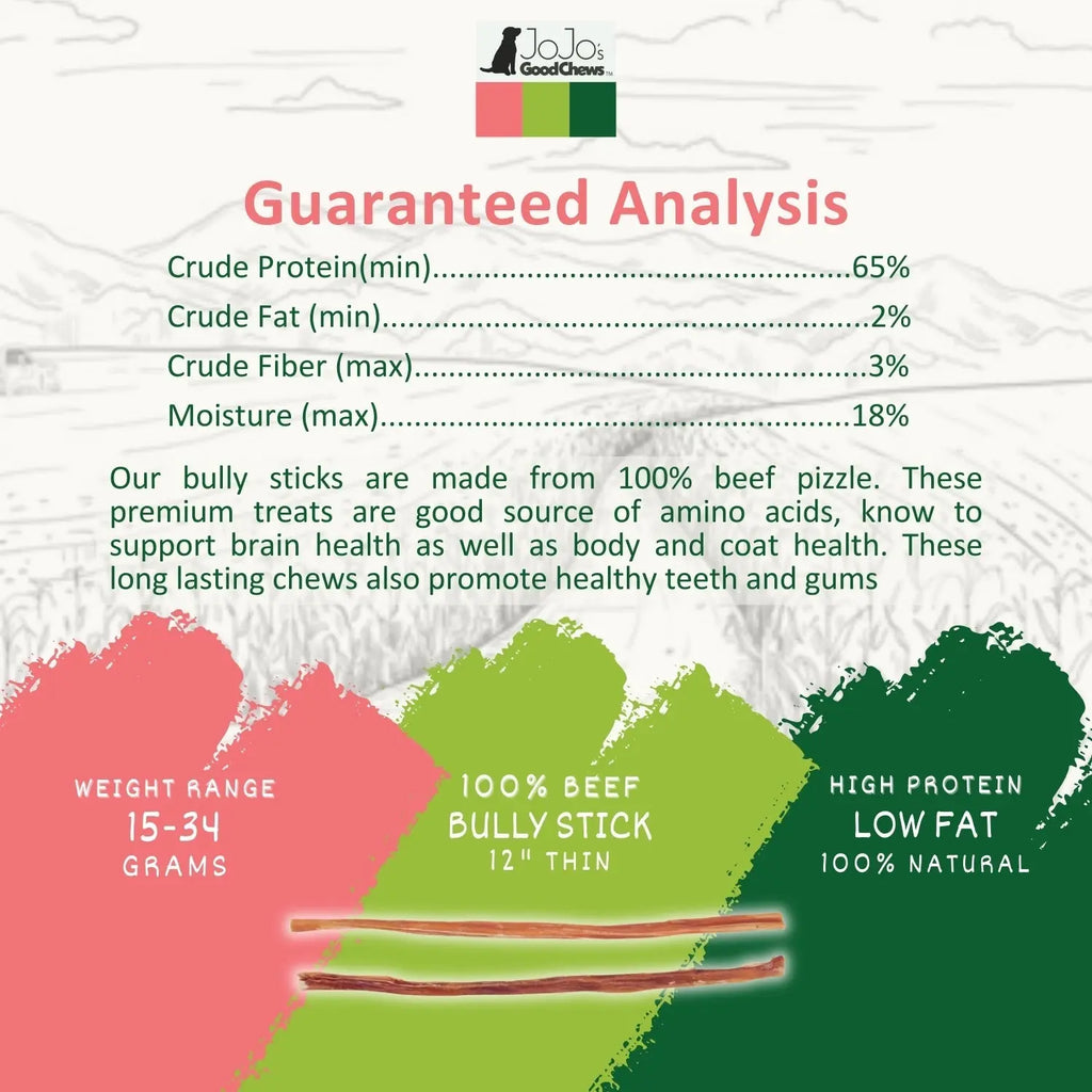 Give your dog the ultimate chewing experience with our premium 12" Thin Beef Bully Sticks. Made from 100% bull pizzle, these natural, protein-packed treats are not only delicious but also nutritious, making them the perfect snack for dogs of all breeds and sizes. With a naturally odor-free formula, you can enjoy a cleaner, more pleasant chewing experience for your furry friend without any harsh smells.
