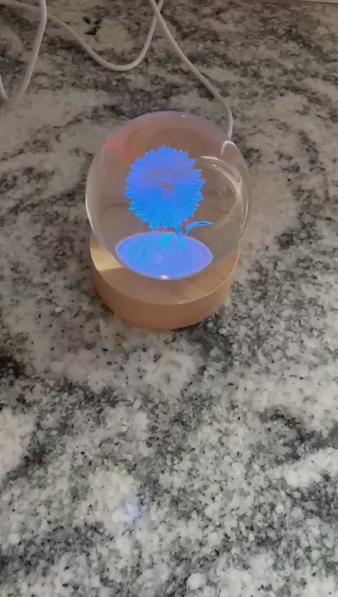Looking for a sunflower gift that truly shines? This 3D crystal LED lamp features a beautifully engraved sunflower suspended inside a crystal-clear orb — and it lights up in a stunning rotation of red, yellow, blue, and green! Soft, vibrant, and soothing, this sunflower mood light is perfect for brightening up bedrooms, desks, or cozy corners.